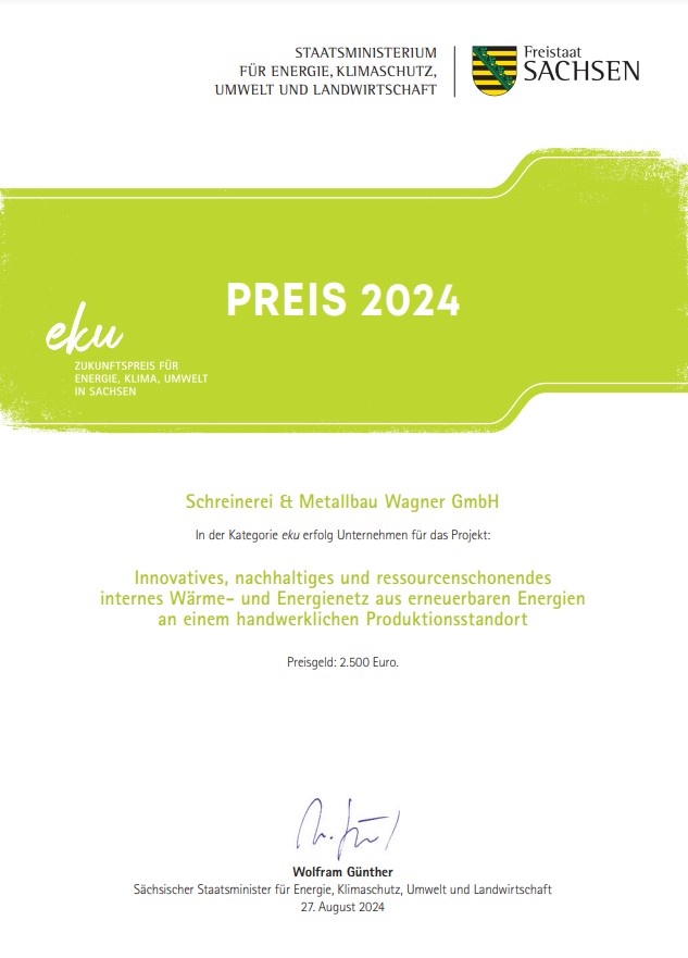 Vom Staatsministerium für Energie, Klimaschutz, Umwelt und Landwirtschaft erhielten wir den eku-Zukunftspreis 2024.