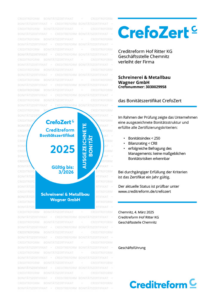 Von der Firma Creditreform Hof Ritter KG wurden wir auch in diesem Jahr wieder für unsere ausgezeichnete Bonität zertifiziert.